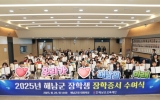 신안 박정래 기자2025. 10.30[나이스데이]재단법인 해남군교육재단(이사장 명현관)은 지난 28일 해남군청 대회의실에서 2025년 해남군 장학생 장학증서 수여식을 가졌다. 수여식에서는 2025년 각 분야 해남군 장학생으로 선발된 우수학생 474명에게 총 4억 5,500만원의 장학금을 지원한다. 이날 수여식에는 장학생 대표 78명과 관계자들이 참석하여 자리를 빛냈다. 식전 공연으로 예체능 분야 장학생으로 선발된 한국무용창작팀과 태권도 시범팀이 수준 높은 공연을 선보이기도 했다. 2025년도 장학금 대상자는 성적우수 장학생 75명, 기능영재 장학생 30명, 희망…