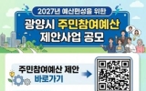 광양 손태성 기자2026. 04.02[나이스데이]광양시는 시민이 예산 편성 과정에 직접 참여할 수 있도록 6월 30일까지 ‘2027년 예산 반영 주민참여예산 제안사업’을 집중 공모한다고 밝혔다. 이번 공모는 예산 과정에 다양한 계층의 참여를 확대하고, 시민이 일상에서 느끼는 불편 사항과 지역 발전을 위한 아이디어를 시정에 반영하기 위해 마련됐다. 제안 분야는 ▲청년 희망 및 중장년 행복 기반 조성 ▲여성 안전 및 어르신 건강 도시 지향 사업 ▲안전하고 쾌적한 도시 조성 등 시정 전반이다. 다만 특정 단체나 개인 지원을 목적으로 하거나 이미 시행 중인 사업, 타…