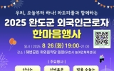 구청 이영욱 기자2025. 08.18[나이스데이]완도군은 8월 26일 오후 7시, 완도 해변공원 야외 음악당에서 외국인 근로자와 주민이 함께 어우러지는 『2025 외국인 근로자 한마음 행사』를 개최한다. 군은 지난 2022년부터 필리핀, 라오스 등과 해외 인력 확보를 위한 업무 협약(MOU)을 체결해 안정적인 외국인 노동력 유치에 힘써왔으며, 결혼이민자 정착 지원, 다문화가정 교육, 외국인 근로자 복지 등 다양한 시책을 추진 중이다. 현재 군에는 1,100여 명의 외국인 근로자가 거주하고 있으며, 그중 결혼이민자 가족의 초청을 통해 근무하고 있는 인력도 다수 포함…