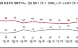 탑뉴스 뉴시스2025. 11.27[나이스데이] 이재명 대통령의 국정수행에 대해 '잘한다'는 긍정 평가는 58%, '잘못한다'는 부정 평가는 32%라는 여론조사 결과가 27일 발표됐다. 엠브레인퍼블릭·케이스탯리서치·코리아리서치·한국리서치가 지난 24일부터 26일까지 만 18세 이상 남녀 1003명을 대상으로 진행한 11월 4주차 전국지표조사(NBS)에서 이 같은 결과가 나왔다. '모름·무응답'은 10%였다. 직전 조사(11월 2주차)와 비교해 긍정 평가는 3%포인트(p) 내렸고, 부정 평가는 3%p 올랐다. 긍정 평가는 40대(78%), 50대(71…