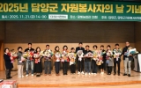 담양 황일섭 기자2025. 11.25[나이스데이] 담양군은 21일 담빛농업관에서 자원봉사자 200여 명이 참석한 가운데 ‘2025 담양군자원봉사자 기념식’을 열고 올해 지역에서 활동한 자원봉사자들의 노고를 격려했다. 이번 기념식은 지역사회 곳곳에서 활동한 자원봉사자들의 헌신을 기리고 자원봉사 문화 확산을 도모하기 위해 마련됐다. 행사는 유공자 표창패 수여, 성과보고, 역량강화 교육, 화합 한마당 순으로 진행됐으며, 다양한 프로그램을 통해 참여자들의 호응을 얻었다. 이날 재난 복구, 취약계층 돌봄, 지역 환경 개선 등 여러 분야에서 활동한 자원봉사자에…