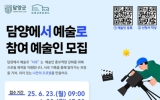 담양 황일섭 기자2025. 06.23[나이스데이](재)담양군문화재단은 '담양에서 예술로, 서로' 프로그램에 참여할 담양 예술인을 모집한다. 올해로 2회째 진행하는 이번 프로그램은 예술인의 홍보역량을 지원하는 동시에 각 장르별 예술인 간 네트워크와 협업을 더욱 확장하는데 중점을 두고 있으며, 예술인 프로필 사진 및 영상 제작을 지원한다. 촬영은 스튜디오 및 개인 작업공간 등에서 진행되며, 예술인의 활동 이력과 작품소개, 예술적 가치를 드러낼 수 있도록 인터뷰 또한 진행할 계획이다. 참여신청은 6월 23일부터 6월 30일까지 공고문과 포스터에 첨부된 구글폼으로…