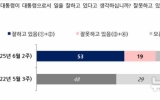 나주 이영욱 기자2025. 06.12[나이스데이] 이재명 대통령의 국정수행에 대한 지지도가 53%를 기록했다는 여론조사 결과가 12일 나왔다. 엠브레인퍼블릭·케이스탯리서치·코리아리서치·한국리서치가 지난 9일부터 11일까지 성인 1001명을 대상으로 진행한 전국지표조사(NBS) 결과에 따르면 이 대통령의 국정운영에 대해 '잘하고 있다'는 긍정적 평가는 53%, '잘못하고 있다'는 부정적 평가는 19%로 집계됐다. 모름·무응답은 28%였다. 2022년 5월에 내놓은 윤석열 전 대통령 취임 후 국정수행 지지율은 48%였다. 이 대통령의 향후 국정 수행에 대…
