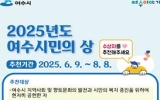 여수 손태성 기자2025. 06.09[나이스데이]여수시는 오는 8월 8일까지 ‘여수시민의 상’과 ‘자랑스런 여수인’ 후보자 추천을 받는다고 9일 밝혔다. ‘여수시민의 상’은 지역사회와 향토 문화 발전에 이바지하고 시민 복지증진에 현저히 공헌하거나 탁월한 재능으로 시민의 명예를 국내외에 선양한 사람에게 주어지는 상이다. 추천 부문은 ▲지역개발 ▲산업경제 ▲교육과학 ▲문예홍보 ▲사회복지 ▲체육진흥 ▲향토방위 등 7개이다. 후보자는 시장, 시의회의장, 유관기관 단체장, 대학장 및 각급 학교장이 추천할 수 있으며, 주민 50인 이상의 연서가 있는 경우 읍·면·동장도 추…
