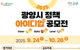 광양 손태성 기자2025. 09.23[나이스데이]광양시는 9월 24일부터 10월 26일까지 ‘2025년 하반기 아이디어 공모전’을 실시한다고 밝혔다. 공모전 명칭은'광양시 정책 아이디업(UP) 공모전'으로, 시민들의 삶을 응원하고(Cheer up), 더 나은 정책을 함께 만들어(Build up), 광양시가 한층 더 높이 도약하는(Level up) 계기를 마련하고자 기획됐다. 공모 주제는 ▲주민생활, 경제활동에 불합리한 민생규제 개선 방안 ▲AI·공공빅데이터 활용 시책 ▲기타 광양시 발전을 위한 정책 아이디어다. 지역 상관없이 누구나 응모할 수 있으며, 참여 희…