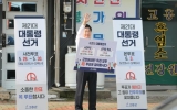 해남 박남도 기자2025. 05.28[나이스데이]공영민 고흥군수는 사전투표 하루 전인 28일 오전, 고흥읍 파리바게트 앞 로터리와 군청 앞에서 투표참여를 독려하는 1인 피켓 거리 홍보에 나섰다. 공영민 군수는 ‘투표가 힘이고, 그 힘이 민주주의를 꽃피웁니다’, ‘군민 여러분! 우리 모두 꼭! 투표에 참여합시다’라는 문구가 적힌 피켓을 들고 직접 거리에 나서 유권자의 소중한 한 표 행사를 호소했다. 또한, 투표 참여 독려 캠페인 후 고흥읍 사전투표소를 방문해 투표소 주변을 둘러보며, 군민들이 불편 없이 투표에 참여할 수 있도록 철저한 준비를 당부하며 직원들을 격려했…