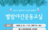구청 이영욱 기자2025. 05.01[나이스데이]광주 광산구가 시민 누구나 저녁 틈새 시간 함께 할 수 있는 무료 건강 프로그램 ‘별밤야간운동교실’을 운영한다. 운동할 시간이 부족한 시민에게 건강한 신체활동 기회를 제공하기 위해 마련한 프로그램이다. 5월 12일부터 7월 말까지 첨단 쌍암근린공원, 선운근린공원, 경암근린공원, 황룡친수공원, 임방울어린이공원 등 광산구 5개 공원에서 주 2회 저녁 7시부터 8시까지 운영한다. 이 기간 월요일, 수요일엔 쌍암‧선운 2개 공원에서, 화요일과 목요일은 경암‧황룡‧임방울어린이 3개 공원에서 운동 교실이 열린다. 전문 강사…