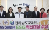 전남 이영욱 기자2025. 04.22[나이스데이]전라남도교육청이 지난 18일 서울 대한상공회의소에서 열린 ‘2025 대한민국 ESG경제대상’ 시상식에서 공공기관 부문 ‘ESG 혁신 대상’을 수상했다. 이번 수상은 지난해 ‘제3회 대한민국 ESG 대상’에 이어 2년 연속 수상이라는 점에서 의미가 크며, 전국 시도교육청 가운데 유일한 수상 기관으로 주목을 받았다. 전남교육청은 ESG(환경 · 사회 · 거버넌스) 가치를 교육행정과 학교 교육과정 전반에 체계적으로 내재화해 온 노력을 높이 평가받았다. 전남교육청은 ‘ESG교육지원센터’ 설립, 2023년 전국 최초 ‘ES…