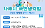 여수 정회준 기자2025. 04.07[나이스데이]전라남도 나주시가 수요자 중심의 민원 편의와 양질의 서비스 제공을 위해 시민 의견을 듣는다. 나주시는 국민권익위원회에서 운영하는 ‘국민생각함’을 통해 오는 4월 30일까지 민원 서비스 개선과 관련한 시민 의견을 온라인으로 접수한다고 7일 밝혔다. 의견 접수는 국민생각함 누리집에서 나주시를 검색한 후 ‘나주시 민원 행정 및 제도 개선을 위한 의견수렴’ 페이지에서 하면 된다. 민원 서류 및 절차 간소화 방안, 취약계층에 대한 민원 편의, 기타 민원 서비스 향상 및 제도개선 등 자유롭게 의견을 개진할 수 있다. …