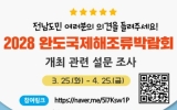 여수 정회준 기자2025. 03.28[나이스데이]완도군은 ‘2028완도국제해조류박람회’에 대한 전남도민 인식 설문 조사를 4월 25일까지 실시한다. 군은 설문 조사를 통해 박람회에 대한 도민 관심도와 기대 효과, 참여 의향 등을 분석하여 국제 행사 승인을 위한 자료로 활용할 계획이다. 설문 항목은 국제해조류박람회에 대한 인지도 및 관심도, 전남 해조류 산업의 글로벌 경쟁력 가능성, 참여 희망 콘텐츠 및 프로그램 유형 등 35개이다. 설문 조사는 온라인 또는 QR코드를 통해 모바일로도 할 수 있다. 군 관계자는 “설문조사는 2028완도국제해조류박람…