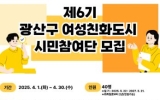 구청 나이스데이2025. 03.28[나이스데이]광주 광산구가 제6기 광산구 여성친화도시 시민참여단을 모집한다. 여성친화도시 시민참여단은 성평등 정책 및 생활환경 개선 사업 등 여성친화도시 사업을 추진하고 정책을 제안하는 역할을 한다. 이번 6기는 △교육·워크숍 통한 역량 강화 △일·가정 균형 문화 조성 캠페인 △안전취약지역 발굴 △마을돌봄공동체 및 가족친화환경 조성 사업 홍보 △광산구 여성친화사업 및 정책 홍보 등 다양한 활동을 펼친다. 또한 광산경찰서와 협력해 공중화장실 불법카메라 탐지 및 여성안심귀갓길 점검 등 안전 모니터링과 성범죄 취약 지역을 집중 점검…