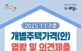 구청 나이스데이2025. 03.24[나이스데이]순천시는 1월 1일 기준 개별주택 가격에 대한 열람 및 의견제출 기간을 4월 9일까지 운영한다고 밝혔다. 이번에 열람 대상 개별주택은 32,389호로, 개별주택 특성 등을 조사해 산정했으며, 가격의 공정성과 객관성을 높이기 위해 한국부동산원(순천지사)의 산정가격 적정성 여부 등의 검증 절차를 마쳤다. 개별주택 가격의 열람은 세정과 및 읍면동 행정복지센터를 방문하거나 순천시 누리집 및 부동산공시가격알리미를 통해 확인할 수 있다. 열람가격에 의견이 있는 소유자 및 이해관계자는 의견서를 작성하여 세정과 및 읍면동 행정복…