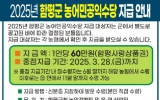 함평 전범석 기자2025. 03.16[나이스데이]전남 함평군이 지역 농어민의 농업 활동을 장려하기 위해 농가당 60만원 상당의 농어민 공익수당 지급을 시작했다. 함평군은 16일 “농어민 공익수당 중점 지급이 지난 14일부터 시작됐으며 28일까지 대상 농어민들은 관할 지역농협에서 수령할 수 있다”고 밝혔다. 앞서, 함평군은 1월 16일부터 2월 7일까지 농어민 공익수당 신청을 받았으며 3월 7일 심의 위원회 거쳐 총 8,199명 중 적격자 7,801명을 지급대상자로 선정했다. 이번 농어민 공익수당은 신분증을 지참해 본인이 직접 수령해야 한다. 단, 질병이나 부상 …