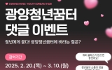 광양 손태성 기자2025. 02.21[나이스데이]광양시와 광양청년꿈터가 지역 청년들의 목소리를 직접 듣기 위해 오는 3월 10일까지 ‘양청년꿈터 댓글 이벤트’를 진행한다. 광양시에 거주하는 18세부터 45세까지의 청년이라면 누구나 이번 이벤트에 참여할 수 있다. 참여 방법은 간단하다. 먼저 광양청년꿈터 인스타그램을 팔로우하거나 네이버 블로그를 이웃 추가한 뒤, ‘광양청년꿈터에 바라는 점’ 게시글에 희망 프로그램이나 청년정책에 대한 의견을 댓글로 작성하면 된다. 이후, 팔로우 인증과 댓글 작성 화면을 네이버 폼으로 제출하면 참여가 완료된다. 휴대전화 번호당 …