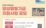 장흥 김창민 기자2025. 02.07[나이스데이]전라남도는 양성평등 문화 확산과 성평등한 사회참여를 확대하고 안전한 도시환경 조성을 위해 오는 17일까지 양성평등기금 사업을 공모한다. 올해 지원 규모는 총 1억 1천만 원이며, 사업당 최대 1천만 원까지 지원한다. 전남에 주사무소를 두고 양성평등 촉진과 여성 인권보호 및 복지증진을 위해 활동하는 단체 및 비영리 법인·비영리 민간단체면 공모에 참여할 수 있다. 공모 분야는 ▲양성평등 문화 확산 ▲성평등한 사회참여 확대 ▲안전한 도시환경 조성 사업 3개 분야로, 2개 이상 시군에 효과를 줄 수 있는 사업이다. 지원…