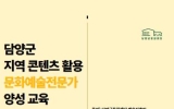 광양 나이스데이2025. 01.17[나이스데이](재)담양군문화재단은 다음달 7일까지 문화예술 전문가 양성 기초과정 참여자를 모집한다고 밝혔다. 재단 문화예술 전문가 양성 과정은 담양군 지역 문화를 기반으로 문화예술전문가를 육성하기 위한 교육으로, 2월 20일부터 4월 3일까지 총 7회차 과정을 매주 목요일(1·2회차 목·금요일) 오후 5시에 진행한다. 이번 교육은 지역 문화를 활용한 콘텐츠 기획을 주제로 다방면의 문화·예술 전문가로부터 문학, 축제, 공연, 뮤지컬과 같은 콘텐츠뿐만 아니라 경영, 마케팅 등에 대한 실무적·학문적 강의를 들을 수 있는 자리로 마련됐…