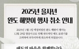 완도 주용규 기자2024. 12.30[나이스데이]완도군은 2025년 1월 1일 신지 명사십리 이벤트광장 일원에서 예정되었던 ‘2025 을사년 완도 해맞이 행사’를 전면 취소한다고 밝혔다. 12월 29일 발생한 무안공항 항공기 사고에 따른 전국적인 애도 분위기를 고려하고 유가족을 배려하기 위해 해맞이 프로그램과 행사를 취소하기로 결정했다. 해맞이 행사는 취소됐지만 신지 명사십리 이벤트 광장을 찾는 방문객들을 위해 안전요원들을 배치할 계획이다. 신우철 완도군수는 “항공기 사고에 따른 탑승객분들과 유가족분들에게 깊은 애도와 위로의 마음을 표한다”라며 “해맞이 …