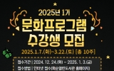 화순 여흥기 기자2024. 12.17[나이스데이]화순군이 화순열린도서관에서 2025년도 제1기 문화프로그램 수강생을 모집한다고 밝혔다. 화순 열린도서관 2025년 1기 문화프로그램은 ▲마음을 위로하는 책(일반 대상) ▲오감톡톡 아기 오감 놀이(유아 대상, 2개 강좌) ▲그림책 냠냠 요리(유아 대상, 2개 강좌) ▲미술로 놀자(유아 대상)이며, 6개 강좌에서 총 65명을 모집한다. 1기 문화프로그램은 2025년 1월 7일부터 3월 22일까지 총 10주에 걸쳐 진행된다. 신청 기간은 12월 24일부터 2025년 1월 3일까지 화순열린도서관 홈페이지를 통해 선착순으로…