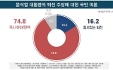 탑뉴스 뉴시스2024. 12.12[나이스데이] 국민의 74.8%가 즉시 하야 또는 탄핵으로 윤석열 대통령의 직무를 정지시켜야 한다는 여론조사 결과가 12일 나왔다. 여론조사 전문회사 리얼미터가 에너지경제신문 의뢰로 지난 11일 전국 18세 이상 남녀 507명을 대상으로 실시한 조사에 따르면 전체의 74.8%가 '즉시 하야나 탄핵으로 대통령 직무를 정지시켜야 한다'고 답했다. '여당의 제안대로 질서있는 퇴진을 해야한다'는 응답은 16.2%이며, '잘 모름'은 9%로 집계됐다. 지역별로 보면 광주·전라에서 즉시탄핵이 83.9%로 높았다. 이어 대전·충…