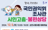 순천 나이스데이2024. 11.29[나이스데이]순천시는 오는 12월 5일 10시부터 16시까지 시청 대회의실에서 국민권익위원회 ‘달리는 국민신문고’를 운영한다고 전했다. ‘달리는 국민신문고’는 국민권익위원회가 주관하는 프로그램으로, 시민들이 공공 서비스와 관련된 다양한 불편 사항을 직접 상담하고 해결할 수 있는 자리이다. 이번 행사에서는 권익위 조사관과 전문가 20여 명이 참여해 행정, 교육, 보훈, 세무, 복지, 노동, 건축 등 공공 서비스뿐만 아니라 소비자 피해, 지적 분쟁, 신용 회복, 민․형사 생활법률 등 생활 속 다양한 문제를 상담하고 해결 방안을 제…
