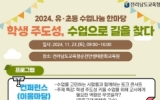 목포 박정래 기자2024. 11.20[나이스데이]전라남도교육청이 23일 전라남도교육청순천만생태문화교육원에서 ‘2024. 유·초등 수업나눔 한마당’을 개최한다. 이번 행사는 ‘학생 주도성, 수업으로 길을 찾다’를 주제로, 학생 주도성 키움 수업 나눔과 전남교육이 나아가야 할 수업의 방향 및 교사의 역할 모색을 위한 공감의 장으로 마련된다. 행사에서는 ‘학생 주도성 키움 수업을 위한 교사에게 필요한 역량’이라는 주제 강연을 비롯해 ▲ 유·초등 공감 토크 콘서트 ▲ 체험형 수업 톺아보기(16부스) ▲ 수업에 바로 적용하는 에듀테크 체험(9부스) ▲ 수업나눔연구회·학…
