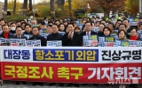 탑뉴스 뉴시스2025. 11.17[나이스데이] 국민의힘은 17일 서울 용산 대통령실 앞에서 검찰의 대장동 사건 항소 포기 관련 외압 의혹을 규명하기 위한 국정조사와 특검 추진을 촉구했다. 장동혁 대표는 이날 오전 서울 용산 대통령실 앞에서 기자회견을 열고 주요20개국(G20) 정상회의 참석을 위해 출국한 이재명 대통령을 겨냥해 "오늘 1호기를 타고 해외로 먹튀를 하겠다고 한다"며 이같이 말했다. 장 대표는 "돌아오면 기다리고 있는 것은 국정조사다. 그리고 그다음은 특검이 될 것"이라며 "추징 보전 해제든, 배임죄 폐지든, 공소 취소든, 한 발짝만 더 나…