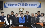 해남 박남도 기자2025. 11.13[나이스데이]광주 북구의회 정달성 의원(용봉·매곡·삼각·일곡동/더불어민주당)이 13일 이숙희 의원과 함께 ‘장애인친화도시 조성을 위한 정책간담회’를 개최했다. 이번 간담회는 북구 장애인친화도시 조성의 현주소를 점검하고, 현장의 다양한 의견을 바탕으로 민·관·정 차원의 공감대 형성과 실질적인 정책 방향을 모색하기 위해 마련됐다. 이날 간담회에는 정달성·이숙희 의원을 비롯해 오방장애인자립생활센터장, 예그리나장애인센터장, 장애인문화관광센터 사무국장, (사)한국신장장애협회 광주협회 사무처장, 전남대 동아리 ‘내일프로젝트’ 대외협력부장,…
