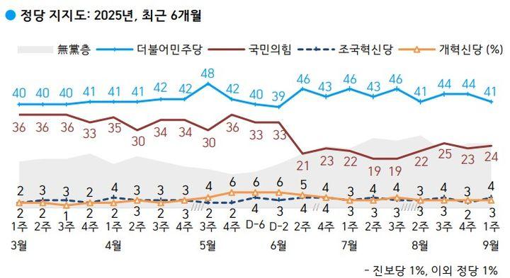 한국갤럽이 지난 2~4일(9월 첫째 주) 전국 만 18세 이상 유권자 1002명을 대상으로 정당 지지도를 조사한 결과 민주당은 41%, 국민의힘은 24%로 집계됐다.