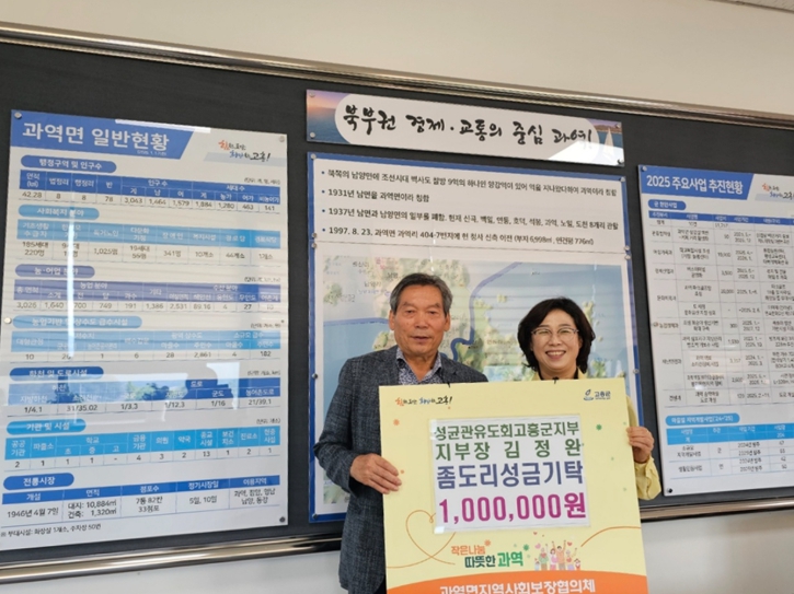 이은영 과역면장은 “지역의 소외된 이웃을 위해 귀한 나눔을 실천해 주신 성균관유도회 고흥군지부 김정완 지부장님께 깊은 감사를 드린다”며 “기탁해 주신 성금은 도움이 절실히 필요한 취약계층 가구에 전달돼 생활 안정과 따뜻한 명절을 보내시는 데 큰 힘이 될 것이다”고 말했다.