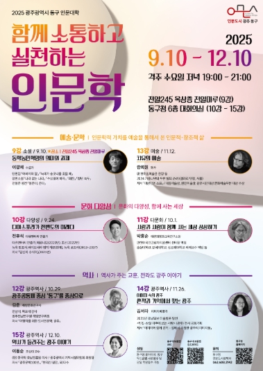 이어 ▲전후석 다큐멘터리 연출가 ‘디아스포라가 한반도의 미래다’(9월 24일) ▲박흥순 다문화평화교육연구소장 ‘사람과 사람이 함께 사는 세상 상상하기’(10월 1일) ▲김준 해양문화연구자 ‘광주공동체 중심 동구를 중심으로’(10월 29일) ▲한희원 화가 ‘치유의 미술’(11월 12일) ▲김서라 이미지 비평가 ‘흔적과 기억에서 찾는 광주’(11월 26일) ▲이동순 조선대 교수 ‘역사가 들려주는 광주 이야기’(12월 10일) 등이 구청 6층 대회의실에서 열린다.