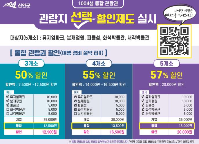 할인 적용 대상 시설은 신안군의 대표 관광지인 뮤지엄파크, 1004섬 분재정원, 퍼플섬, 화석박물관, 서각박물관 등 총 5개소이다.