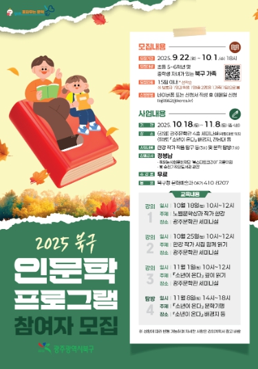 문인 북구청장은 “이번 프로그램이 문학을 읽고 사유하며 인문학의 소중한 가치를 체감하는 계기가 되기를 바란다”며 “앞으로도 문화 향유 기회 확대를 위해 체감도 높은 정책을 펼쳐 나가겠다”고 말했다.
