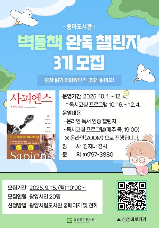 모집인원은 20명, 접수 기간은 9월 28일까지다. 참여 신청은 광양시립도서관 누리집의 ‘독서·문화마당’, ‘수강 신청’ 메뉴를 통해 가능하며, 자세한 사항은 중마도서관팀으로 문의하면 된다.