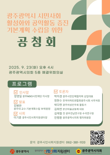 공청회는 이기훈 광주시민사회지원센터장의 사회로 진행되며, 기본계획수립전담팀(TF) 위원장인 김병완 광주대학교 교수가 최종보고서를 발표한다.