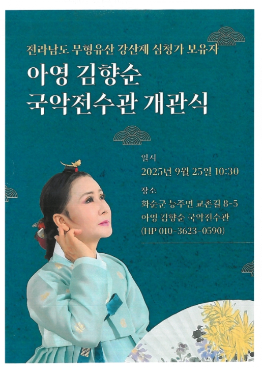 김향순 명창은 평소 우리 국악의 보존 전승을 위해 ‘아영 김향순 국악전수관을 꿈꿔왔으며, 이를 위해 2024년부터 능주면 남정리에 목조구조 114㎡ 규모인 국악전수관 건축공사를 몸소 추진하여 이번에 완공했다.