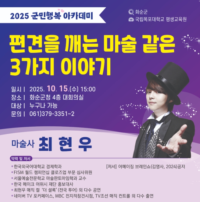 조미화 화순군 인구청년정책과장은 “최현우 강사의 흥미로운 강연을 통해 군민 여러분이 편견을 깨는 새로운 시각과 창의적 사고를 경험하시길 바란다”라고 전했다.