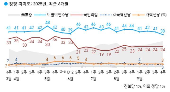 이어 개혁신당과 조국혁신당 각각 3%, 진보당은 1%, 이외 정당·단체 1%, 지지하는 정당이 없는 무당(無黨)층은 30%로 나타났다.