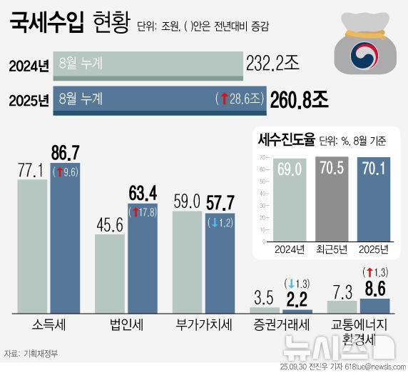 기획재정부가 30일 발표한 '2025년 8월 국세수입 현황'에 따르면 올해 1~8월 누계 국세수입은 260조8000억원으로, 전년 같은 기간보다 28조6000억원 증가했다.