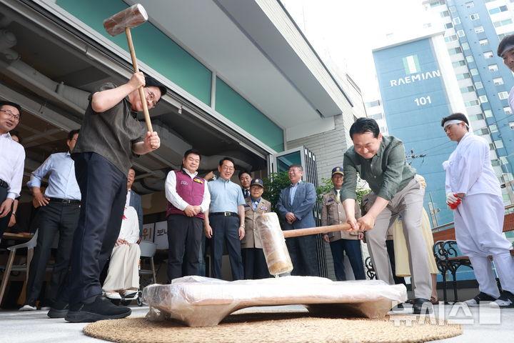장 대표와 송 원내대표는 송편 빚기에 앞서 직접 번갈아 가면서 떡메를 치기도 했다. 김재원·양향자·우재준 최고위원 등도 떡메를 잡았다.