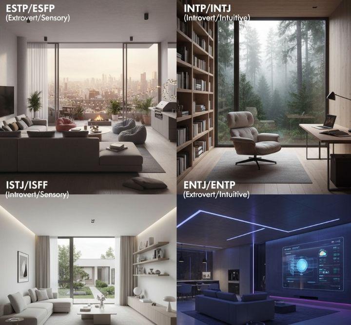 INFJ (예언자), INFP (중재자): 당신은 이상적이고 몽환적인 감성을 가진 낭만주의자다. 자연과 예술 속에서 영감을 얻으며, 독특한 분위기의 공간을 선호한다. 통유리창으로 자연 채광이 가득 들어오는 전원주택이나, 앤티크 소품으로 가득 채운 빈티지 주택이 당신의 예술적인 영감을 자극할 것이다.