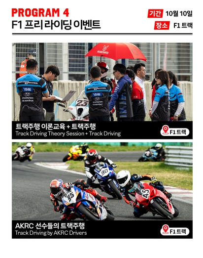 10일에는 일반 바이크 라이더들을 대상으로 전문 선수들의 이론교육이 진행된다. 서킷 주행을 통해 안전한 주행 기술을 습득할 수 있으며, 모터스포츠 저변 확대와 건전한 바이크 문화형성에 긍정적인 영향을 줄 것으로 기대된다.