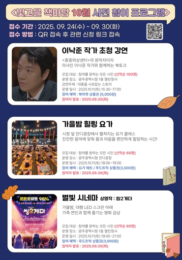 한편 ‘빛고을 책마당’ 일부 프로그램은 사전 예약제로 운영되며, 광주문화예술통합플랫폼 ‘디어마이광주’를 통해 신청 가능하다. 자세한 사항은 광주시 문화유산자원과로 문의하면 된다.