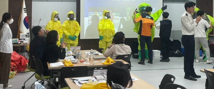 훈련은 ▲생물테러 대응 이론 교육 ▲개인보호복(레벨 A, C) 착·탈의 실습 ▲다중탐지키트 사용법 ▲현장활동 계획 수립 및 위험구역 설정 등 실습 위주로 진행됐다.