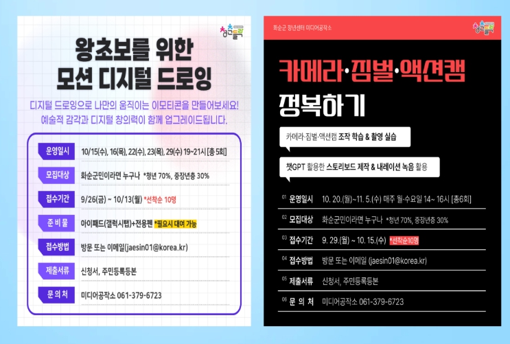 조미화 인구청년정책과장은 “영상과 디지털 아트 두 분야를 직접 체험하며, 창의성과 실무 역량을 함께 키울 기회가 되길 기대한다”라고 말했다.