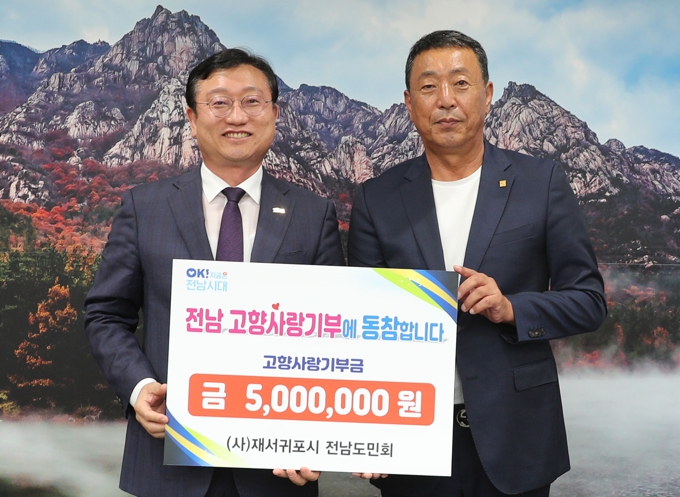 이번 기부금은 (사)재서귀포시 전남도민회원이 고향에 대한 변함없는 사랑과 감사의 마음을 담아 마련한 것으로, 기탁식에는 장은술 회장, 박상식 상임부회장, 박종근 부회장, 이관식 부회장, 강승원 부회장, 김상도 감사, 박성준 총무 등 주요 향우들이 참석했다.