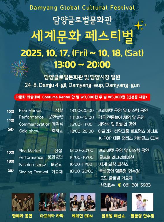 주요 프로그램으로는 ▲전통의상을 선보이는 글로벌 패션쇼 ▲직접 입어보는 의상체험 ▲세계 전통문화 공연 ▲K-POP 커버댄스 ‘데몬 헌터스’ 무대 ▲노래자랑과 버스킹 공연 ▲세계 먹거리와 벼룩시장 등이 준비됐다.