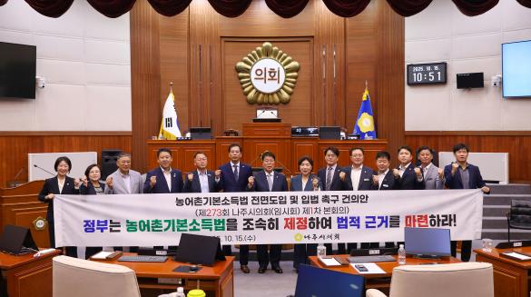나주시의회는 이번 건의안을 통해 ▲농어촌기본소득법을 조속히 제정하여 법적 근거를 마련할 것과 ▲시범사업을 넘어 전국 농어촌 지역 전체를 대상으로 농어촌기본소득을 전면 실시할 것, ▲중앙정부의 재정 부담률을 대폭 상향하여 지역 간 불균형을 해소하고 정책의 보편성을 확보할 것을 강력히 촉구했다.