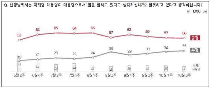 직전 조사(10월1주차)와 비교해 긍정 평가는 1%포인트(p) 내렸고, 부정 평가는 1%p 올랐다.