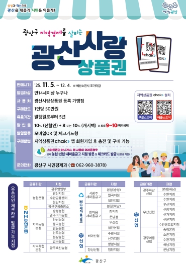 박병규 광산구청장은 “광산사랑상품권이 지역 내 소비 순환 구조를 강화하고 침체한 골목상권에 활력을 불어넣는 마중물이 되길 바란다”며 “많은 시민이 참여해 지역경제 회복에 함께해주길 바란다”고 말했다.