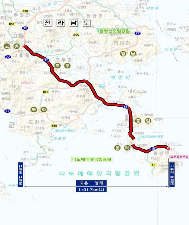 국도 15호선 고흥~봉래 확장사업은 전남 고흥군 고흥읍 호형리~봉래면 예내리(나로우주센터) 31.7㎞ 구간을 기존 2차로에서 4차로로 확장하는 사업이다. 총 사업비는 6521억원(예비타당성조사 기준) 규모다.